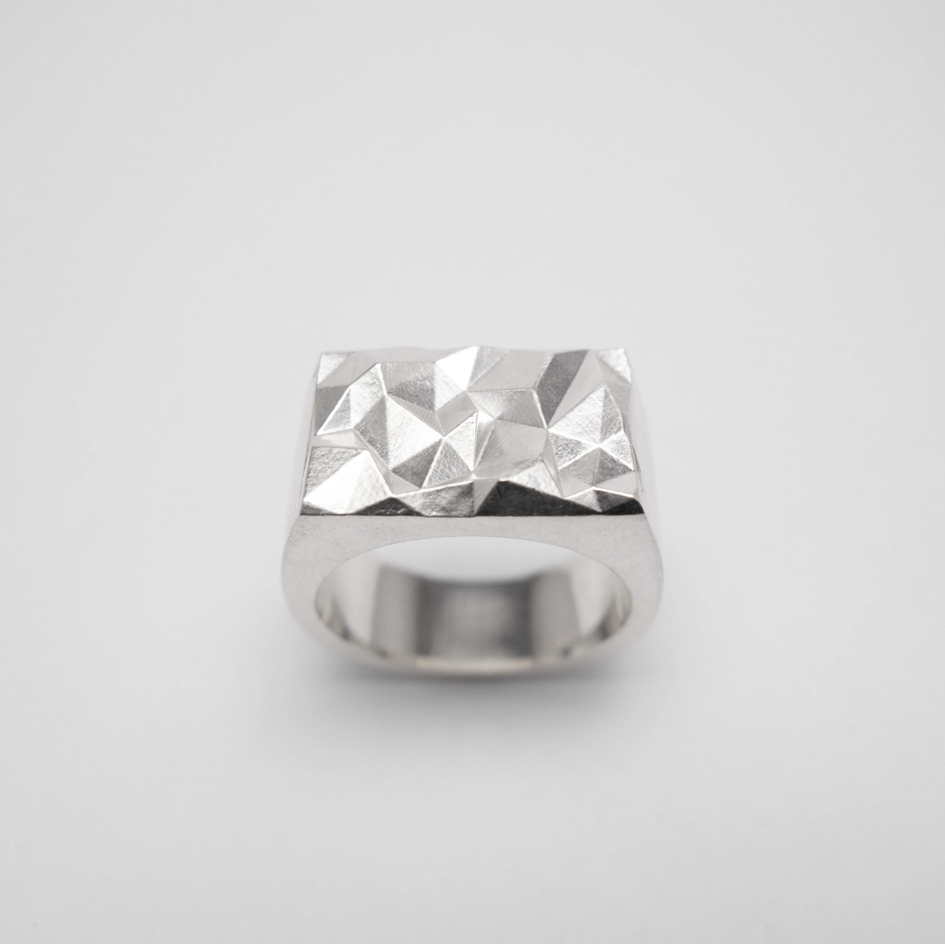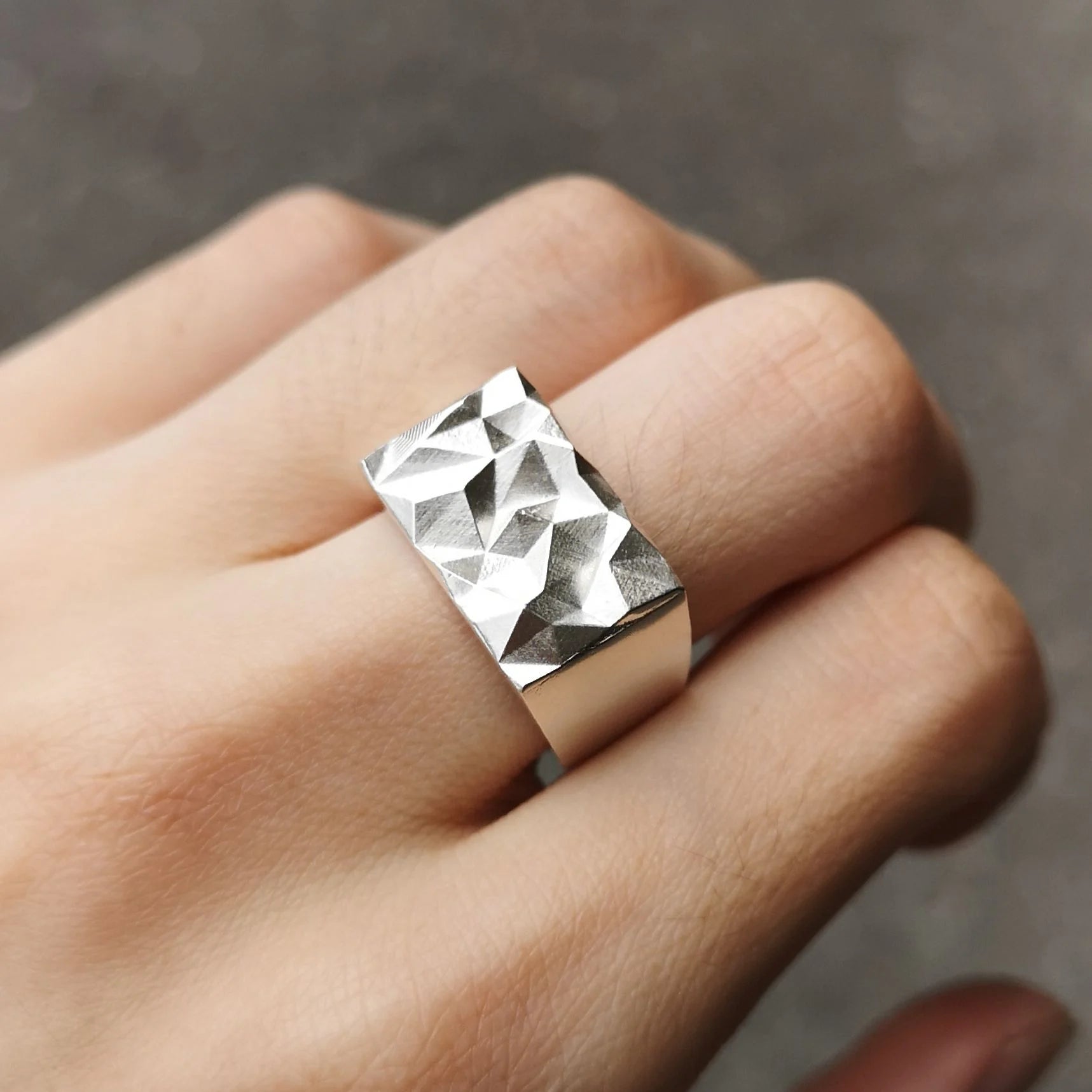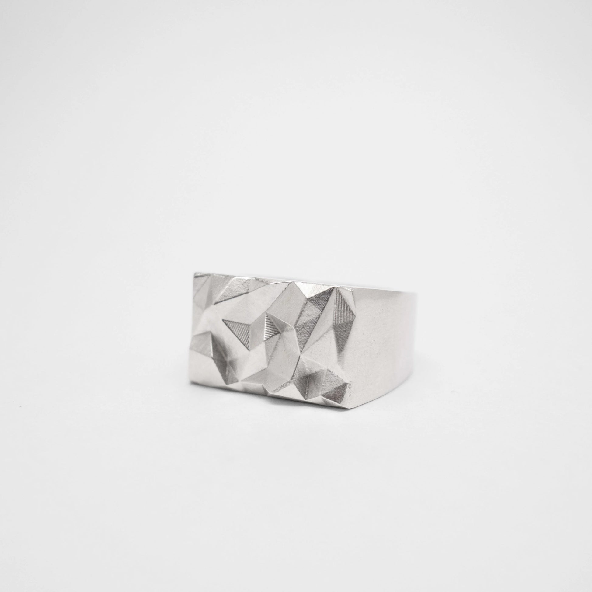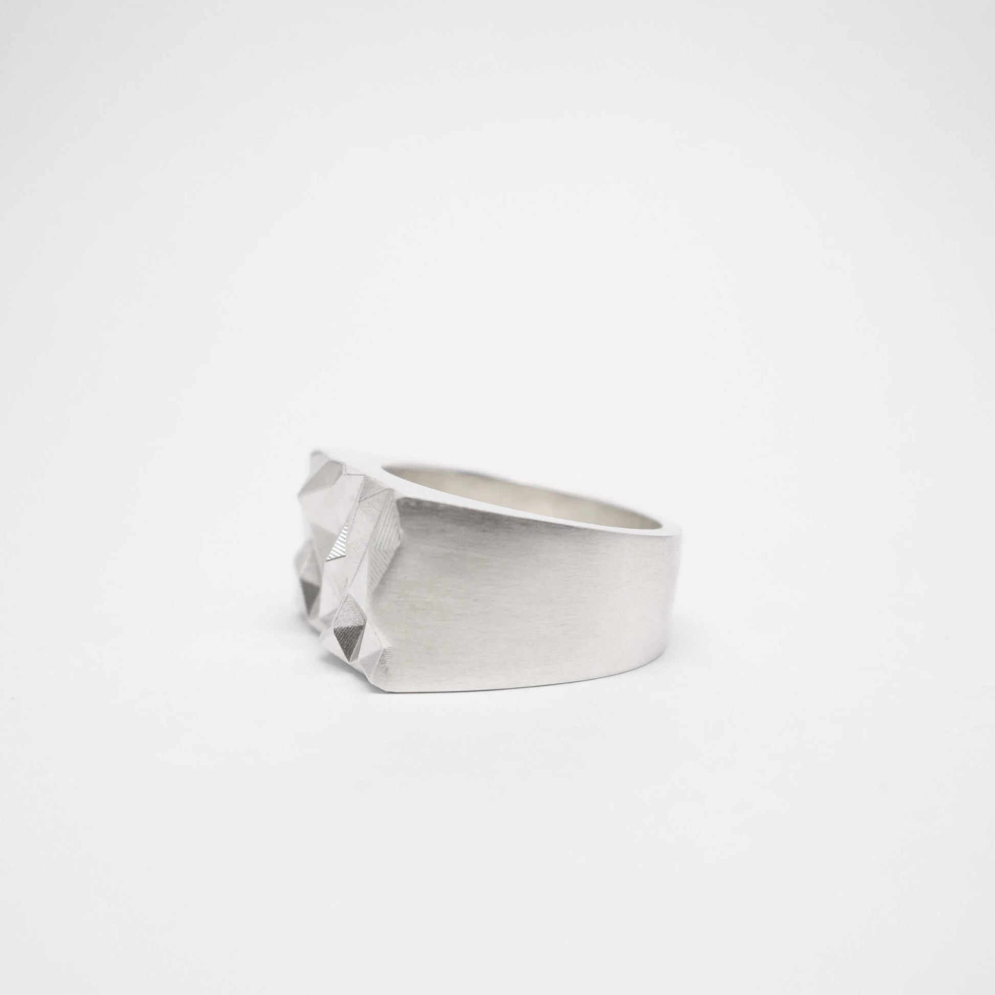 A ring inspired by the stark, majestic shadows of an iceberg. The beautiful interplay of irregular triangular facets creates a captivating landscape of light and shadow on your finger.