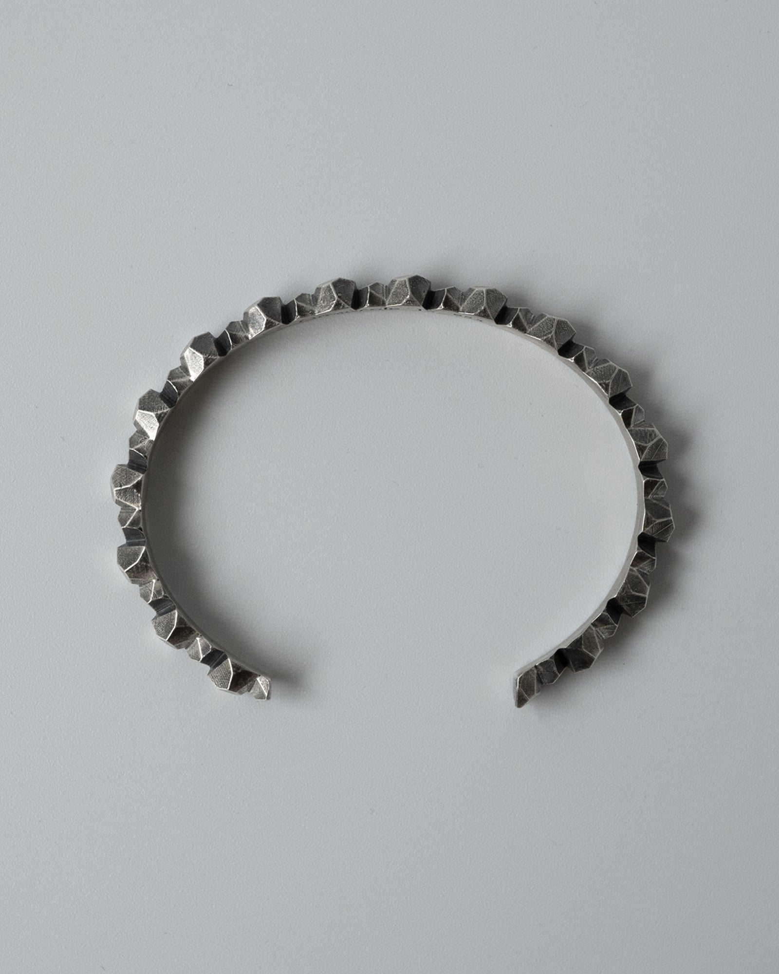 This bangle features a unique design inspired by a row of geometric pebbles. The sharp, angular forms create distinct shadows, giving the piece a bold and captivating presence on your wrist.